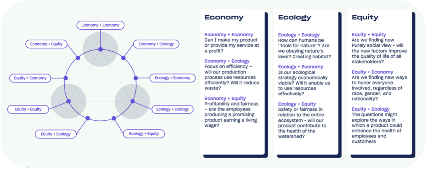 - We translate each of the nine Triple Top Line dimensions into one critical question, designated to address the tensions that can emerge between the dimensions. This creates a structured and consistent framework for assessing impact, across the three dimensions of economy, ecology, and social equity.